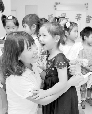 9月10日,在北京市第五幼儿园附属实验园,小朋友在献上自制的纸花后拥抱老师。当日是我国第30个教师节,北京市第五幼儿园附属实验园的小朋友在老师们的指导帮助下,利用橡皮泥、羽毛等材料,制作手工艺品,并唱歌跳舞,用环保、节俭的方式,向老师们表达了节日的问候。 本栏文图均据新华社电
