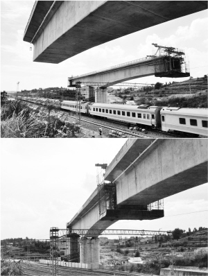 上、下图分别为沾益特大桥转体施工前与转体施工后(9月10日摄,拼版照片)。9月10日下午,经过1个小时的缓慢转动,矗立在沪昆铁路沾益火车站两侧、重达8300吨的两段“巨无霸”桥梁,向跨越的沾益火车站平转25.3°,实现桥梁精确合龙。沾益特大桥是沪昆高铁云南段的控制性工程。新华社记者 潘洁 摄