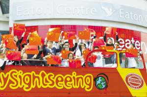 多伦多华侨华人“歌唱祖国”迎接中国国庆 9月16日,在加拿大多伦多邓达斯广场,演唱会参与者在停靠于路边的一辆观光车上手持五星红旗演唱并合影。当日,一场名为《多伦多·中国心》、时长约10分钟的演唱会在加拿大多伦多市中心邓达斯广场举行。 新华社发