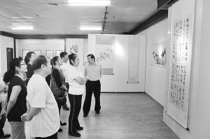 9月25日下午,庆祝建国65周年周口书画作品展在周口市群众艺术馆开幕。本次展览为期5天,共展出从全市征集的书画精品60余幅。图为群众参观展出作品。 (记者 王亚辉 摄)