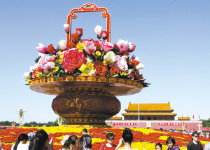 9月27日,游客在天安门广场“中国梦”花坛前留影。国庆节即将来临,北京街头迎接国庆65周年的主题花坛为节日营造出祥和喜庆的气氛。据悉,天安门广场及长安街沿线花卉布置基本完毕,共有75万盆、120个品种鲜花亮相。