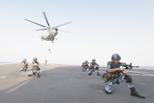 9月26日,在长白山舰的飞行甲板上,特战队员索降后展开战术进攻训练。针对近期亚丁湾、索马里海域护航任务的不断变化,当地时间9月26日,中国海军第十八批护航编队组织舰载直升机和特战队员进行索滑降训练。