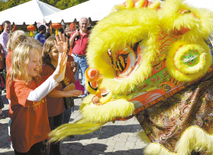 9月26日,在美国马里兰州马里兰大学,小朋友们开心地和舞狮玩耍。当日,马里兰大学孔子学院举行活动,庆祝中国孔子学院成立十周年及全球首个“孔子学院日”。