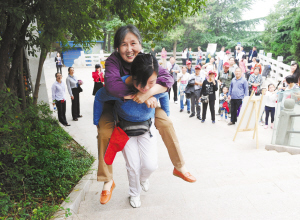 9月27日,在西安市骊山,母女俩在参加背父母上山活动。当日,西安市华清宫景区举办“陪父母登骊山”重阳登高活动。