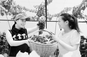 “十一”国庆长假期间,两位游客在商水县邓城镇天力葡萄种植专业合作社里采摘葡萄。据了解,该合作社是由邓城镇大学生村干部、“最美村官”张耀带领村民创办的,占地160余亩。每逢节假日,前来旅游观光和采摘葡萄的游客络绎不绝,取得了良好的经济效益。岳建辉 刘飞 摄