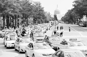华盛顿出租车司机罢工抵制打车软件 10月8日,在美国首都华盛顿,出租车司机在宾夕法尼亚大街参加罢工。当日,数百辆出租车的司机在华盛顿市中心举行罢工和游行,抗议打车软件公司参与行业竞争。打车软件的迅速兴起,使大量私家车进入出租车行业,已在多个国家和地区引发正规出租车司机的集体抗议。 新华社记者 殷博古 摄