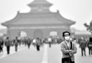 北京遭遇雾霾 10月19日,游客戴着口罩在天坛游览。当日,北京遭遇雾霾。北京市环境保护监测中心在其微博上发布的信息显示,当日10时北京城六区的PM2.5浓度为347微克/立方米,空气污染较重。