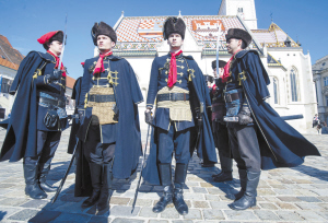 10月18日,来自克罗地亚“领带军团”的士兵系着传统领巾在首都萨格勒布圣马可广场参加“领带日”庆祝活动。