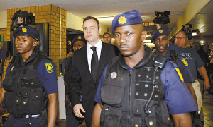 10月21日,南非著名短跑运动员“刀锋战士”奥斯卡·皮斯托瑞斯(中)抵达位于比勒陀利亚的北豪登省最高法院。