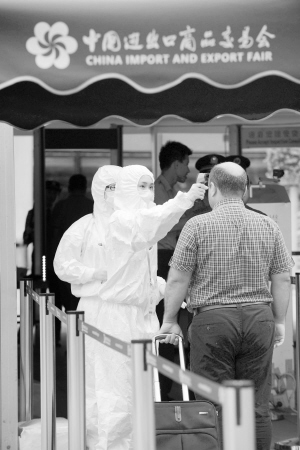 10月23日,大会卫生保障办的志愿者为进入展馆的人员测量体温。当日,第116届广交会二期开幕,大会埃博拉疫情防控举措进一步升级,所有入场人员均要接受红外线体温探测,如果显示体温超过37.5℃,现场工作人员将用水银体温计再次测温并向大会卫生保障办报告,体温超标者将被送往指定医院接受后续检查。新华社发