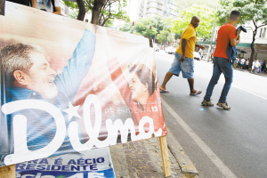 10月25日,在巴西贝洛奥里藏特,行人从街头一处印有现任总统、劳工党候选人迪尔玛·罗塞夫和前任总统卢拉头像的广告牌前经过。