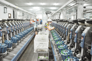 由太康县马厂镇招商引进的太康鸿图纺织有限公司,位于该县产业集聚区内,主要从事棉花收购、加工、销售、纺织等。企业采用国际先进设备,既提高了产品档次,又大大减轻了工人的劳动强度。自2013年投产以来,企业生产经营形势良好。图为车间内工人正在作业。