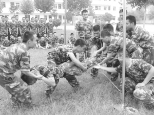 为丰富新兵业余文化生活,武警周口支队新训大队积极开展形式多样的文体活动,有效释放了新兵身心压力。图为官兵进行心理行为训练“穿越火线”时的情境。(毛凯 摄)
