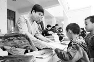 10月31日,著名书法家、热心公益事业爱心大使汪太银到商水县汤庄乡西赵桥小学,为当地留守儿童捐赠《弟子规》等书籍以及一些文具用品。记者 岳建辉 通讯员 魏红 摄