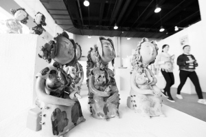 2014西湖艺术博览会秋季展开幕 11月6日,观众从展出的陶艺作品《范儿》旁走过。当日,2014年西湖艺术博览会·秋季展在杭州市和平国际会展中心举行。本次博览会为期5天,以“当代原创”为理念,设置了一系列书画、雕塑主题学术展览,展览面积近2万平方米。共有十几家来自中国、法国、美国、意大利、日本、西班牙、俄罗斯等国家和地区的艺术机构参展。