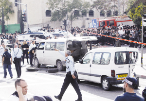 11月5日,以色列边境警察在东耶路撒冷袭击事件现场警戒。耶路撒冷5日再次发生巴勒斯坦人驾车袭击以色列警察和路人事件,造成1人死亡,13人受伤。