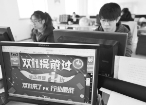 电商快递备战“双十一” 11月9日,山东省邹平县一家家纺生产厂的网络营销人员在电脑前忙碌。11月11日网络购物热潮临近,电商企业纷纷加派员工,备足货源,快递公司也增加仓储和配送能力,备战网络购物高峰。 新华社发