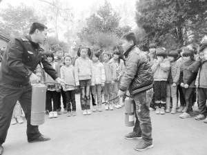 在全国消防安全宣传日来临之际,商水县舒庄派出所开展“消防安全进校园”活动。图为11月6日,舒庄派出所民警蒋子一在杜店小学为学生讲解灭火器使用方法。乔连军 摄
