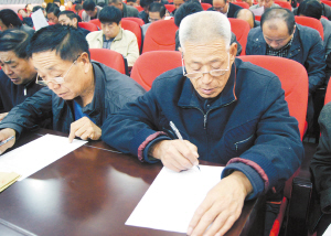 近日,扶沟县纪委、监察局组织来自社会各界的评议代表,利用2天时间对全县各基层站所进行民主评议,旨在通过这一活动切实拉近群众与各基层站所之间的距离。图为评议代表正在认真填写问卷。(卢付昌 摄)