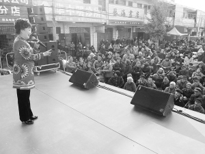 11月17日,省歌舞剧团在商水县平店乡集市上开展“舞台艺术送农民”精彩演出。近年来,在上级党委、政府和文化部门的关怀下,一台台免费大戏送到了老百姓家门口,广大群众足不出户就能欣赏到精彩的戏曲、歌曲、舞蹈、杂技、相声、小品等文艺节目。赵永昌 摄