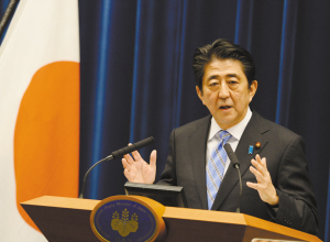 11月18日,在日本东京首相官邸,日本首相安倍晋三向记者发表讲话。安倍晋三18日晚宣布,将于21日解散众议院并提前举行大选。 新华社记者 马平 摄