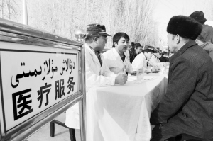 新疆:“暖心”小分队活跃在乡间 在新疆和田地区墨玉县阔依其乡库勒艾日克村,武警新疆总队的“三送三共”小分队为当地老百姓开展医疗服务(11月19日摄)。连日来,由武警新疆总队组成的第三批“三送三共”小分队走入田间地头,来到新疆南疆农户人家,为老百姓送来了文艺节目、医疗用品等。据武警新疆总队介绍,“三送三共”活动是指“送医、送法、送文化以及共建、共育和共保平安”。活动自今年实施以来,武警新疆总队已先后组织了三批人员来到南疆地区开展活动,受到了当地各族群众的欢迎。 新华社记者 赵戈 摄