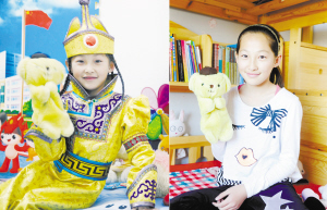 这张拼版照片左图为新华社记者张领于2009年10月23日拍摄的娜荷芽和自己的“会说英语”的玩具合影;右图为新华社记者邵琨于2014年11月12日拍摄的娜荷芽展示她的“会说英语”的玩具。