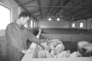 11月23日,项城市新桥镇南赵庄村村民魏可勇在察看生猪生长情况。近年来,该镇积极引导农民调整种养产业结构,因地制宜发展特色养殖业,让农民走上了增收致富新路子。(张永久 摄)