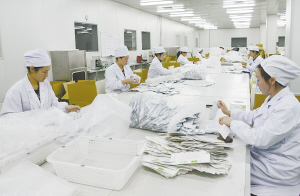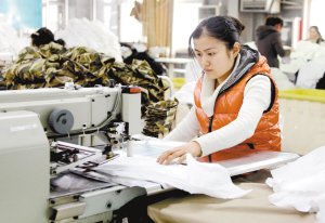 右下 郸城县鼎祥制衣有限公司积极推广分散加工这一新型用工模式,在巴集、钱店、石槽等乡镇建立了15个生产车间,帮助4000多名农民在家就业,取得了良好的社会效果。