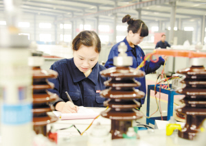 右图 昨日,两名工人在北京博瑞莱智能科技周口有限公司生产车间内调试产品。该公司生产的“智能可控自动调容调压配电变压器”,在利用有载开关实现变压器自动调容调压方面达到国内领先水平。(记者 沈湛 摄)