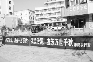 为提升广大群众的法治意识,周口农行通过悬挂宣传标语、发放宣传折页、开设咨询平台等方式,积极进行普法宣传。图为淮阳支行在营业厅前悬挂宣传标语。(梁磊 摄)