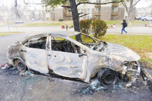 11月26日,在美国密苏里州弗格森迈克尔·布朗被枪杀的地点旁边,一辆汽车被烧毁。