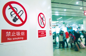 11月28日,北京南站站内大厅的墙柱上贴有“禁止吸烟”的标示。当日,北京市第十四届人民代表大会常务委员会第十五次会议表决通过《北京市控制吸烟条例》,该条例将于2015年6月1日起实施,《北京市公共场所禁止吸烟的规定》同时废止。《北京市控制吸烟条例》明确所有公共场所、工作场所室内区域及公共交通工具禁止吸烟,约定文保单位、体育场及部分以未成年人为主要活动人群的室外场所禁止吸烟。新华社发
