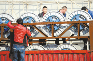 11月27日,太康县纺织工业园区内几名工人搬卸新进设备。近几年来,园区内一大批对该县经济社会发展有重大影响的重点工程项目建设顺利推进。该县紧盯东部沿海产业转移,依托本地丰富的棉花资源,以棉纺织业为主导,规划建设了纺织工业园区,从而加快了承接产业转移步伐。