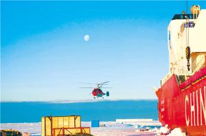 “雪龙”号在中山站外陆缘冰地带开展卸货作业 12月3日晚,直升机在“雪龙”号旁吊运货物向中山站运输。经过连续3天的艰难破冰,中国第31次南极科学考察队乘坐的“雪龙号”科考船日前穿越普里兹湾,抵达中山站外陆缘冰地带。 新华社记者 白阳 摄
