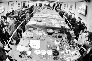 ↑12月8日,参观者在发布会现场参观新征文物史料。当日,“史料新证——2014年新征文物”新闻发布会在侵华日军南京大屠杀遇难同胞纪念馆举行。发布会公布了7602件新征文物史料,这些史料来自中国、美国、日本、英国、德国等14个国家,内容涉及南京大屠杀、性暴行、毒气战等日本侵华罪行,以及世界反法西斯战争等主题。工作人员按照文物史料类、音像图片类、口述史料类三个大项及枪械、军用品、军用装备、史料等15个小项,对新征文物史料进行分类。据初步统计,文物史料大项中的军用装备小项共有626件;口述史料大项共征集486件,包括抗战老兵实物151件、抗战老兵手印335件。