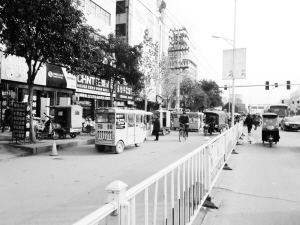 9时50分,督查组一行沿交通大道向西前住川汇区运管所具体负责的另一个执法卡点——荷花汽车站门前,刚驶过中州大道,就看到几辆红色三轮车一字排开(图③)停靠在汽车站东边的非机动车道上,一辆交通执法车就停在荷花汽车站门前,两者相距不足50米。看到督查人员后,两名交通执法人员才从车上下来。面对为啥不去查扣这些三轮车的询问,其中一名执法人员明确表示,没有看到三轮车载客营运,他们没有办法进行执法、查扣。