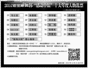 截至11月27日,“感动中原”组委会办公室共收到有效的推荐材料156份。根据各地各单位的推荐情况,省委宣传部邀请有关单位负责同志及专家、学者组成初评委员会,对各单位推荐人选进行了初评。按照评选程序,初评委员会从推荐材料中评选出了候选人20名和1个先进集体,现将候选人(集体)名单及事迹公布(按姓氏笔画为序),请广大群众积极参与,踊跃投票,评选出您心目中的2014“感动中原”十大年度人物。