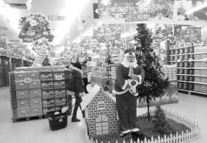 昨日,某超市内布置了圣诞老人、圣诞树。距离圣诞节还有10天,我市部分商场和超市已经进入 “圣诞模式”,昨日记者在街头看到,一些商家已在布置店铺营造节日气氛,小商品市场的圣诞树、小礼品等也进入热销状态。商家纷纷抢滩圣诞市场,让市民感受到浓厚的节日气氛。 (记者 孙安平 摄)
