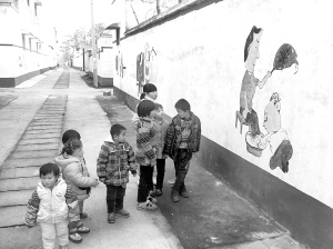 12月17日,淮阳县城关镇外孔湾村一群小朋友在观赏街道墙体上绘制的一幅幅尊老爱幼的画面。改善农村人居环境工作今年6月启动以来,该县遵循搞好试点、以点带面、循序渐进的原则,以乡镇政府所在地和国道、省道沿线村庄为重点,使群众生活环境更卫生、优美。(记者 侯俊豫 摄)
