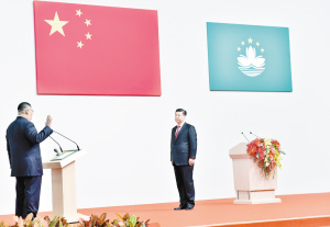 新华社澳门12月20日电 (记者 霍小光 赵卫 牛琪) 庆祝澳门回归祖国15周年大会暨澳门特别行政区第四届政府就职典礼20日上午在澳门东亚运动会体育馆隆重举行。中共中央总书记、国家主席、中央军委主席习近平出席并发表重要讲话。他强调,在中央政府、澳门特别行政区政府和社会各界人士共同努力下,在全国各族人民大力支持下,“一国两制”在澳门的实践必将谱写出新的精彩篇章,澳门这朵祖国的美丽莲花必将绽放出更加绚丽、更加迷人的色彩。
