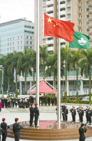 12月20日,澳门金莲花广场举行升旗仪式,庆祝澳门回归祖国15周年。 新华社发
