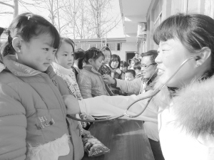 近日,商水县舒庄乡的党员医务志愿者在该乡中心幼儿园为留守儿童进行健康检查。当日,该乡纪委组织6名党员医务志愿者到该乡中心幼儿园开展迎新年送温暖活动,为200多名留守儿童进行了健康检查。