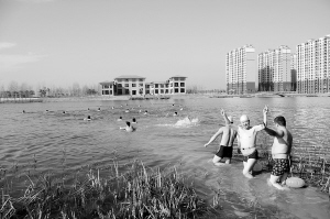 左上图:1月1日是“全国冬泳日”。项城市冬泳协会的36名冬泳爱好者破冰跃入水中,用这一特殊的方式欢庆2015年的到来。大家以此挑战自我、强身健体、磨练意志,倡导全民健身、健康生活、祝福新年。(张永久 摄)