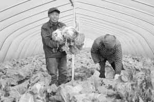 1月4日,项城市贾岭镇白杨树村农民正在采摘大棚白菜。该镇把发展蔬菜大棚作为拉动农业转型升级的一项重要举措,优化了种植格局,使大棚蔬菜成为农村经济新的增长点。(张永久 摄)