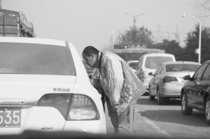 昨日,一名中年男子在市区主干道的十字路口向过往司机乞讨。