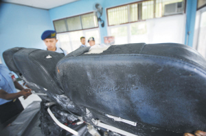 1月6日,在印度尼西亚庞卡兰布翁,印尼警方正在整理亚航失事客机坐垫等残骸。 新华社发