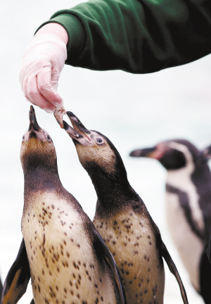 1月5日,在英国伦敦动物园,工作人员在盘点时给企鹅喂食。当日,英国伦敦动物园对园内的750余种动物进行盘点。均为新华社发