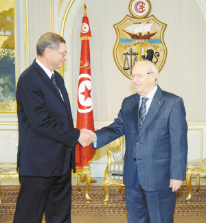 1月5日,突尼斯总统埃塞卜西(右)与埃西德握手。突尼斯议会第一大党突尼斯呼声党当日提名哈比卜·埃西德为新政府总理。