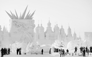 1月6日,游客在太阳岛雪博会主塑《绽放》前游玩拍照。
